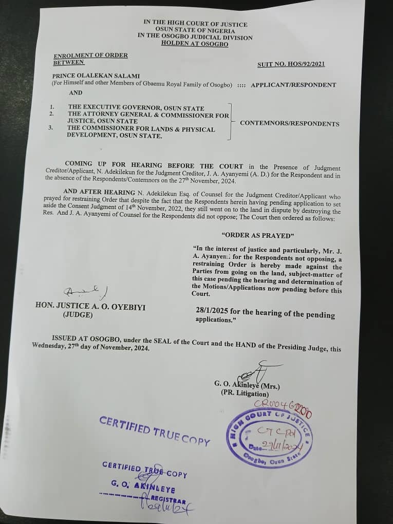 According to reports, the Osun Government had earlier made moves to re-possess the land despite a 2021 Court Judgment that gave ownership to the Gbaemu Royal family. The re-possession attempts led to the harassment of one M. A Yusuf, who was on duty as counsel to the Gbaemu family, to effect the 2021 judgment.